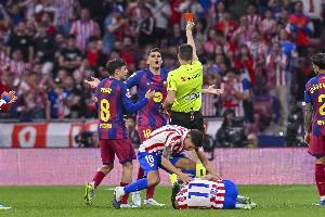 体育资讯4月7日讯 西甲第30轮比赛,巴萨在客场以2-1的比分战胜马竞。本场比赛,赫拉德·马丁解围时踢到阿尔马达脚踝,主裁判第一时间出示了红牌,在VAR介入后,他改判为黄牌,这一判罚引进了马竞方面的巨大不满。