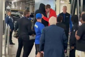 勒布朗·詹姆斯和库珀·弗拉格在勒布朗离开球场前拥抱...
